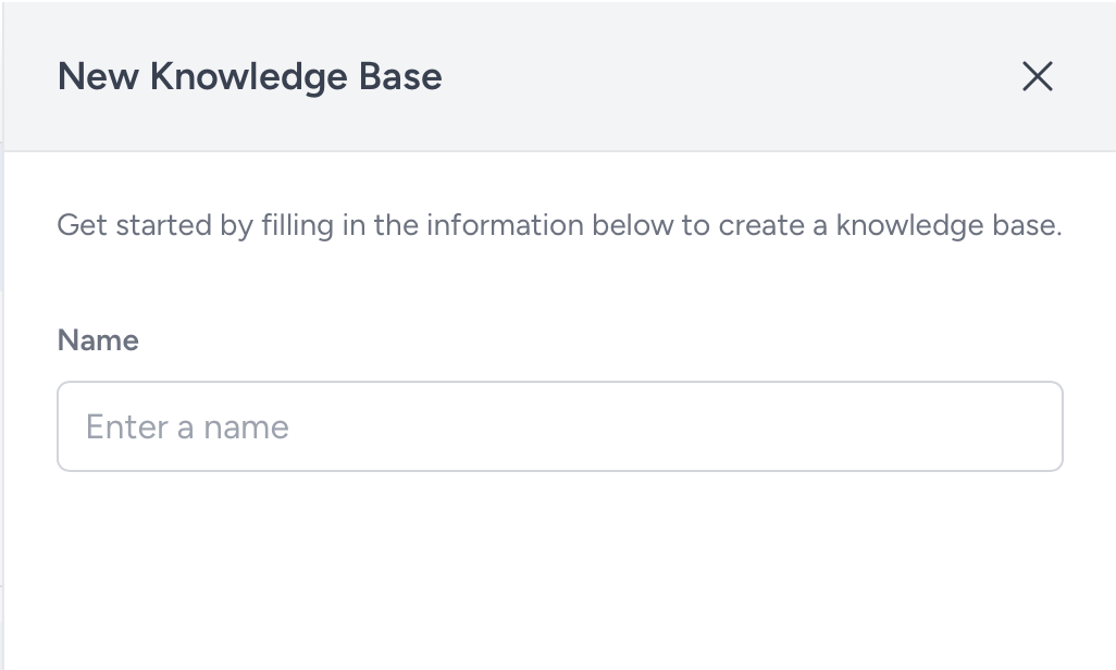 - Enter the desired Name of the Knowledge Base in the pop-up window that will display on the right, then click the green Create Knowledge Base button in the bottom-right.
