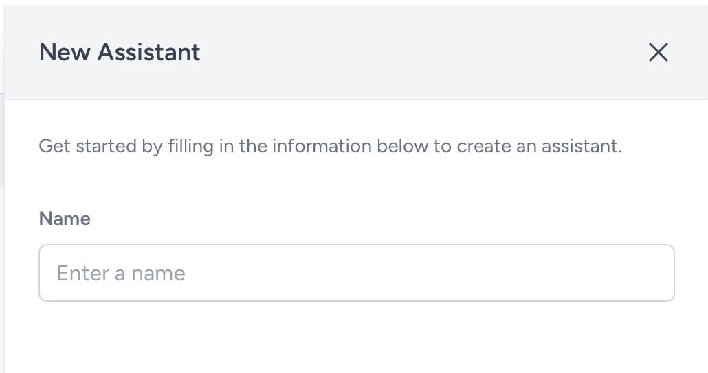 - Enter the desired Name of the Assistant in the pop-up window that will display on the right, then click the green Create Assistant button in the bottom-right.